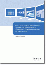 Evidence-based health information is a prerequisite for informed choice. Also employees demand more and especially trustworthy information. The demand for evidence-based health information is based on ethical rights. Chapter 2 and 3 of the present report of the manual for the development of evidence based health information for workers outlines the methods that were used to develop the manual. Subsequently, results of the criteria are presented in evidence tables. Finally, the conclusion points out the relevance of updates of the manual.