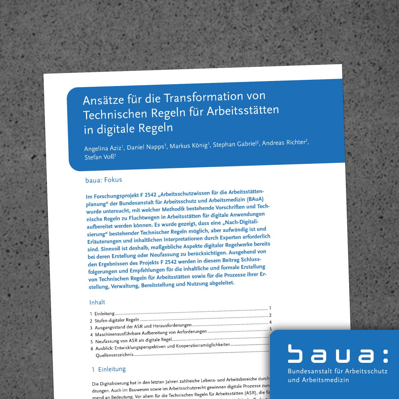 Als Ressortforschungseinrichtung machen wir Wissen für Politik, Praxis und Öffentlichkeit nutzbar. Die Wissenschaftlerinnen und Wissenschaftler der BAuA schaffen dafür unabhängige, hochwertige Forschung: Sie erkennen frühzeitig mögliche Risiken für Sicherheit und Gesundheit der Beschäftigten – ebenso wie Chancen für eine menschengerechte Arbeitsgestaltung. Im Fokus stehen die Veränderungen der Arbeitswelt und die Aufgabe, bei neuen Technologien und Organisationsformen Sicherheit und Gesundheit von Anfang an mitzudenken.